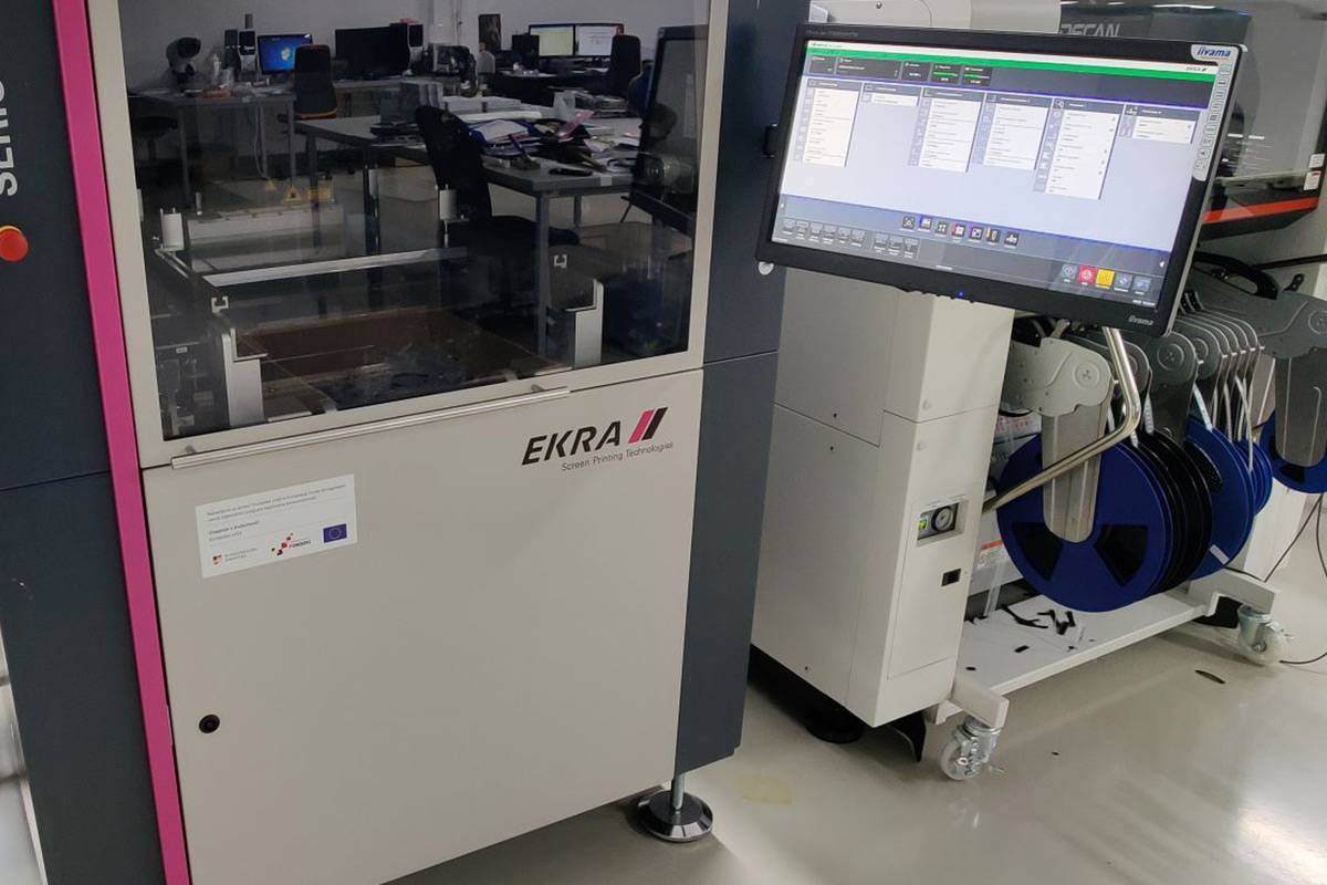 Ulaz linije opremljen je ASYS Bare Board Loaderom koji dodaje PCB ploče u EKRA. EKRA Serio 4 000 je stencil printer koji je u potpunosti programibilan i ima optički pregled ispisa, optičko podešavanje fiduciala i automatsko čišćenje. Format ispisa je 600 x 400 mm. Svi linijski elementi povezani su ASYS transporterom koji prenosi PCB ploče na SAMSUNG SM482 Pick & Place, HELLER 1707 MK III i ASYS Unloader.