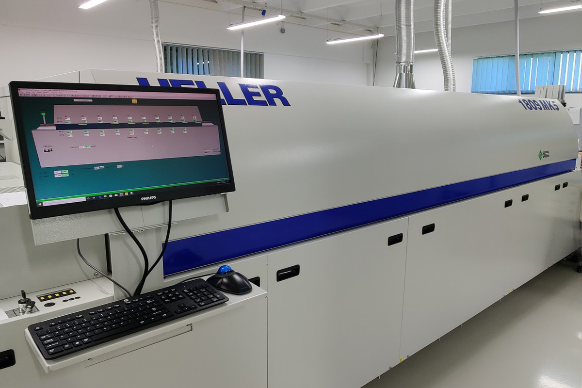 Komponente su zalemljene na PCB ploče u reflow peći HELLER 1809 MK5 koja ima 9 grijaćih i 2 rashladna područja sa širinom lanca transportera do 450mm, te minimalnom potrošnjom energije. Za proces optimizacije koristi se Dynamic Profiling sustav za kontrolu lemljenja. Nakon toga, PCB ploče prolaze optičku i elektroničku inspekciju PARMI AOI i pohranjuju se u ASYS Unloader koji je programabilan i prilagodljiv svim vrstama spremnika.