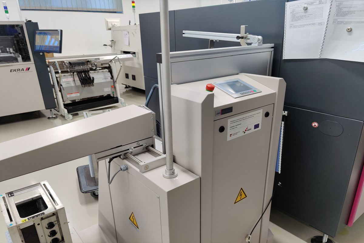 Ulaz u liniju opremljen je ASYS PCB Magazine Loaderom koji dodaje PCB ploče iz skladišnog spremnika u EKRA. EKRA Serio 4 000 je stencil printer koji je u potpunosti programibilan i ima optički pregled ispisa, optičko podešavanje fiduciala i automatsko čišćenje. Format ispisa je 600 x 400 mm. Svi linijski elementi povezani su ASYS transporterom koji prenosi PCB ploče u SAMSUNG DECAN F2 i HELLER 1809 MK5 reflow peć. SAMSUNG DECAN F2 je stroj za odabir i postavljanje s dvije trake i dva portala s 10 glava i brzinom od 80 000 komponenti na sat. Postavlja komponente od 0402 do >16 mm, a s fiksnom kamerom do >42 mm.